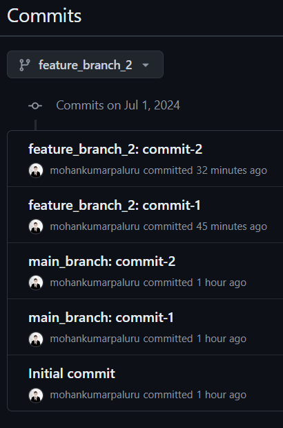 In both feature branches, rebasing was not done before each push. This causes conflicts with the timelines during rebase and requires a force push. The force push will change the commit times to just after the rebase, resulting in the loss of the original commit times of feature branches.